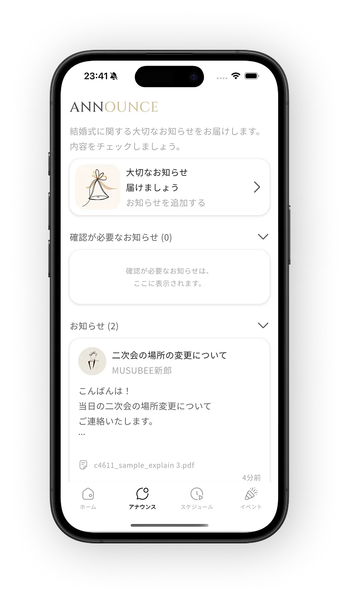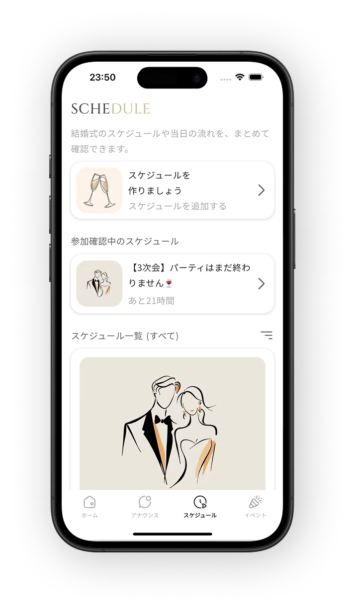 アプリ内で結婚式を新規作成。式場情報やゲストリストを登録して、準備を始めましょう。