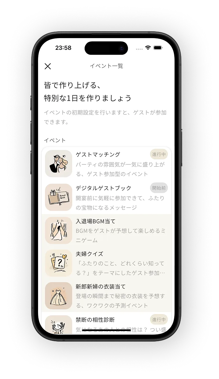 結婚式当日、ゲストはスマホからイベントに参加。会場全体が一体となって盛り上がる特別な体験を。